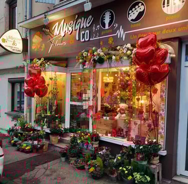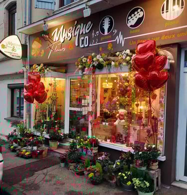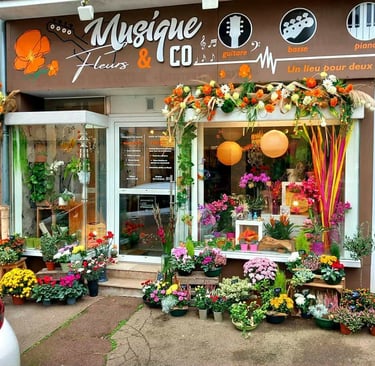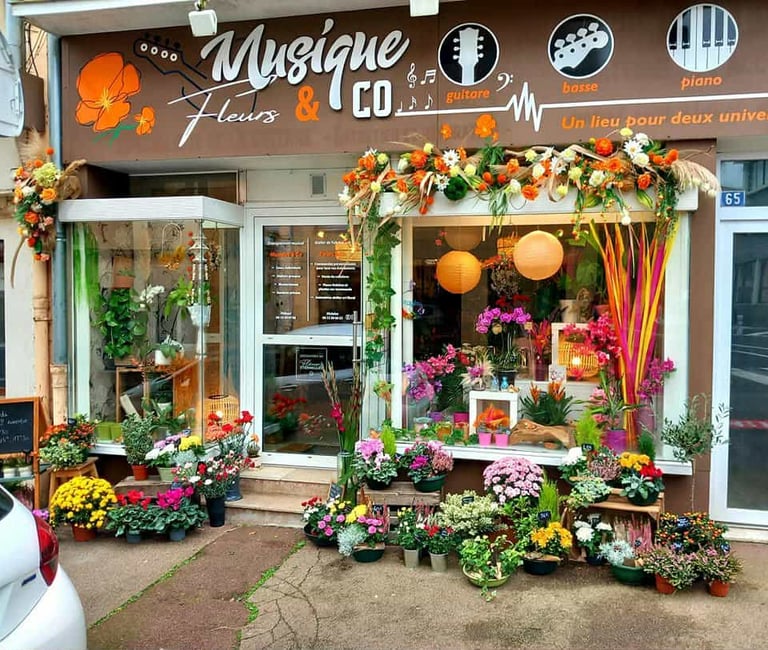 Bienvenue dans notre atelier à Mâcon ! En haut, ma boutique de fleurs, en bas les cours de musique de Thibaut. Nous partageons le lieu autour de nos deux univers créatifs.