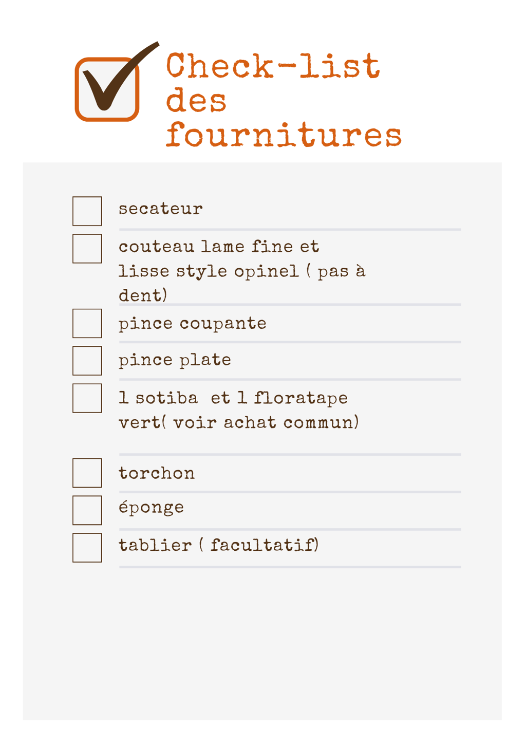 Matériel de base à fournir pour les cours adultes (sécateur, couteau…)