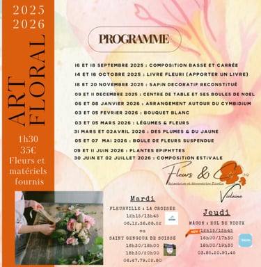 Rejoignez-moi dans l'un de mes cours collectifs d'art floral organisé par la Ville de Mâcon à l'Espace Culturel et de Loisirs de Bioux, ou au Foyer rural de Saint-Gengoux-de-Scissé ou encore à La croisée de Fleurville. 3 lieux, 6 créneaux horaires !